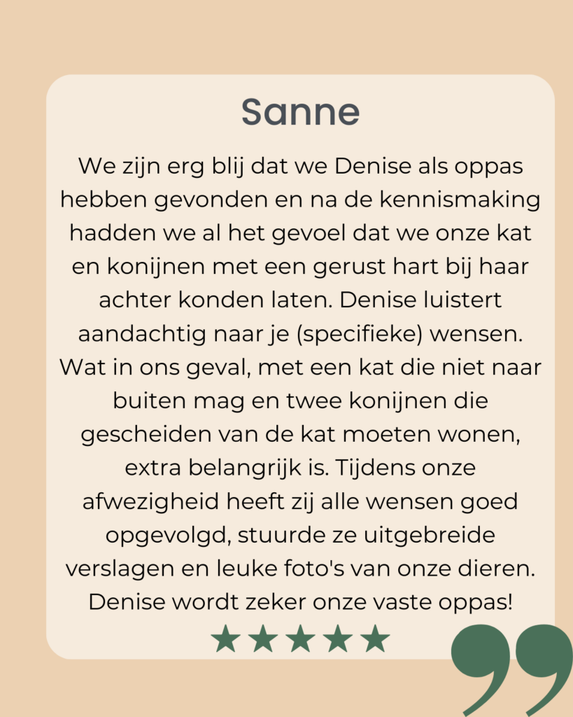 Reviews Lees hier meer reviews Reserveren Vul onderstaand formulier in om een reservering aan te vragen en ik neem zo snel mogelijk contact met je op om de mogelijkheden te bespreken. Schakel JavaScript in je browser in om dit formulier in te vullen.Naam *VoornaamAchternaamE-mailadres *Telefoonnummer *Adres & Woonplaats *Let op, ik doe alleen huisbezoeken in Gouda, Moordrecht, Gouderak, Haastrecht, Reeuwijk, Stolwijk en WaddinxveenStartdatum reservering *Einddatum reservering *Aantal bezoeken per dag *Eén bezoek per dagTwee bezoeken per dagAantal huisdieren *Namen van de huisdieren *Heeft je huisdier medicatie nodig? *JaNeeOpmerkingenVoorkeur contact via *WhatsAppE-mailVersturen